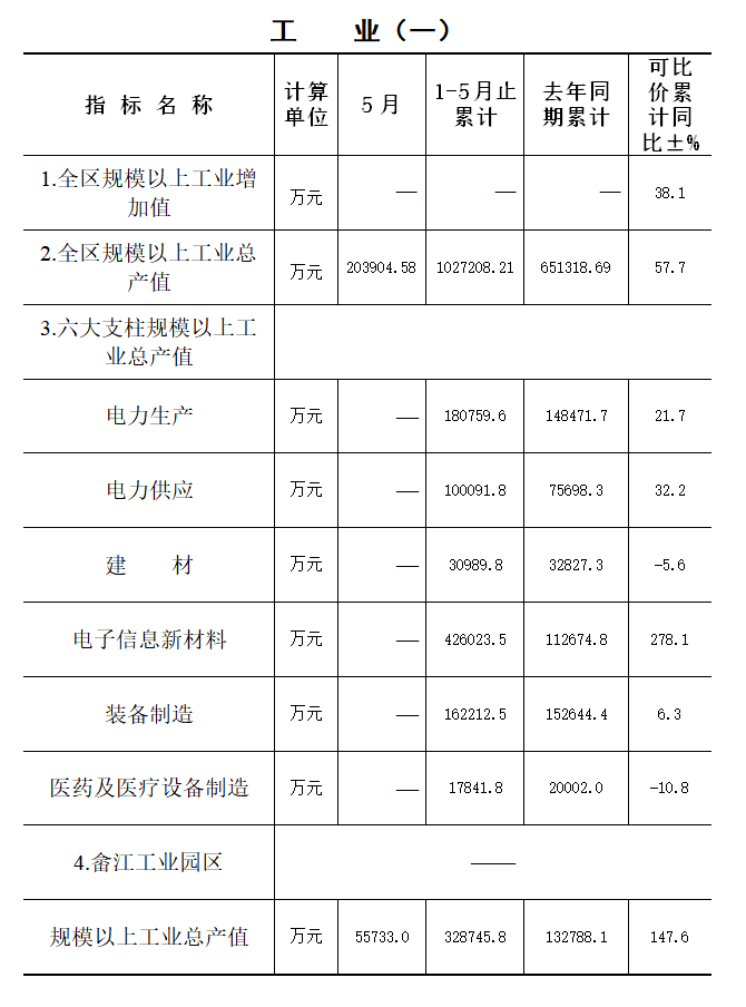 1-5月,全區(qū)規(guī)模以上工業(yè)增加值同比增長38.1%;實(shí)現(xiàn)工業(yè)總產(chǎn)值102.72億元,同比增長57.7%。