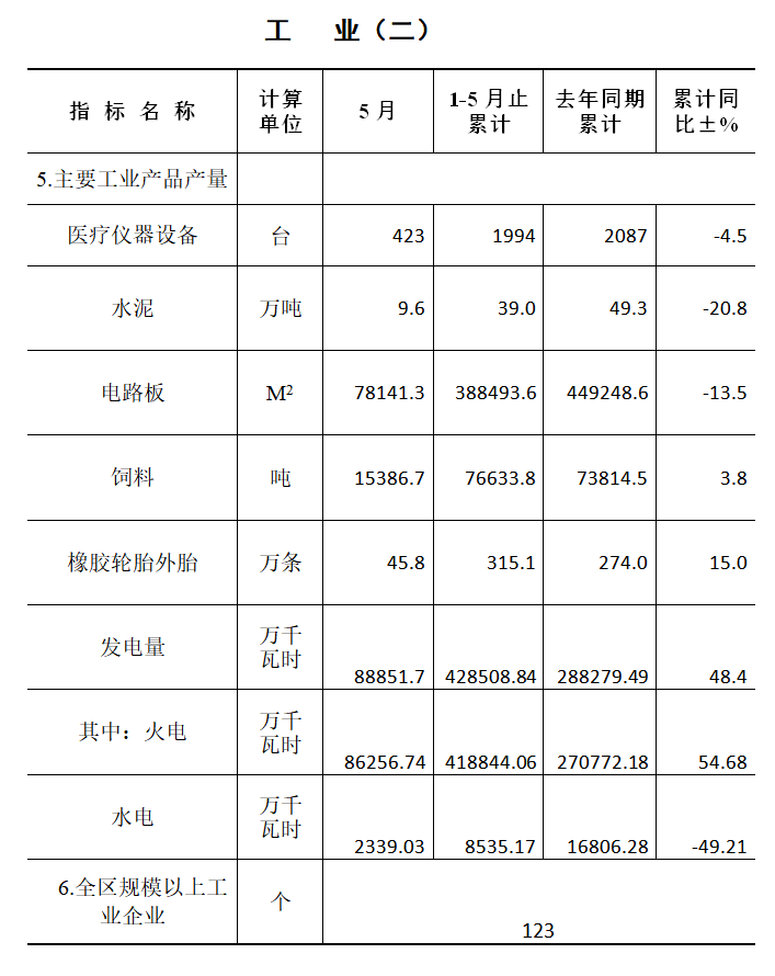 1-5月,全區(qū)全社會(huì)用電量11.4億千瓦時(shí),同比增長26.9%。工業(yè)用電量6.63億千瓦時(shí),同比增長39.6%;其中規(guī)模以上工業(yè)用電量5.81億千瓦時(shí),同比增長48.2%。