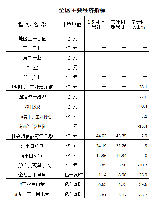 1-5月,全區(qū)公共財(cái)政一般預(yù)算收入完成3.85億元,同比下降30.7%;一般公共預(yù)算支出完成26.07億元,同比增長7.5%。