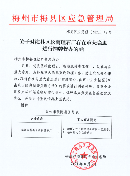 關(guān)于對梅縣區(qū)松南理石廠存在重大隱患進行掛牌督辦的函(梅縣區(qū)應(yīng)急函【2021】47號).pdf