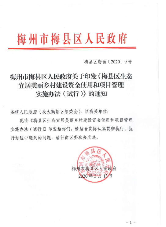 梅州市梅縣區(qū)人民政府關(guān)于印發(fā)《梅縣區(qū)生態(tài)宜居美麗鄉(xiāng)村建設(shè)資金使用和項目管理實施辦法(試行)》的通知