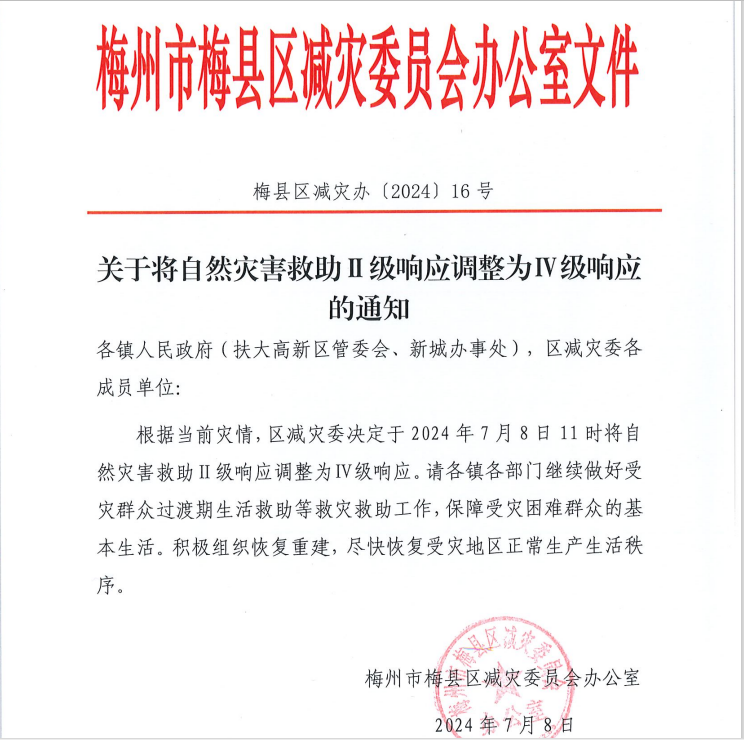 根據(jù)當(dāng)前災(zāi)情,區(qū)減災(zāi)委決定于2024年7月8日11時(shí)將自然災(zāi)害救助Ⅱ級(jí)響應(yīng)調(diào)整為Ⅳ級(jí)響應(yīng)。