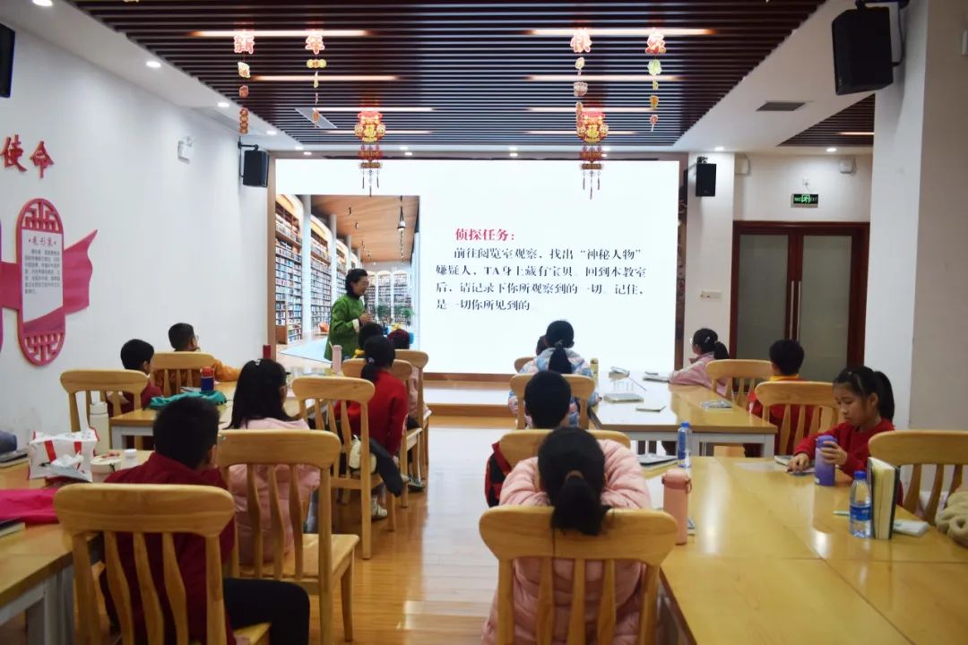 推理環(huán)節(jié)后,活動迎來高潮 —— 孩子們化身“現(xiàn)場目擊者”,前往圖書館閱覽室開展“尋寶之旅”,尋找三位神秘人,他們懷揣“寶藏”。要求返回教室后,記錄下所見所想。大家浩浩蕩蕩出發(fā)了,同學(xué)保持良好秩序來到閱覽室,悄無聲息地默默觀察,找尋。