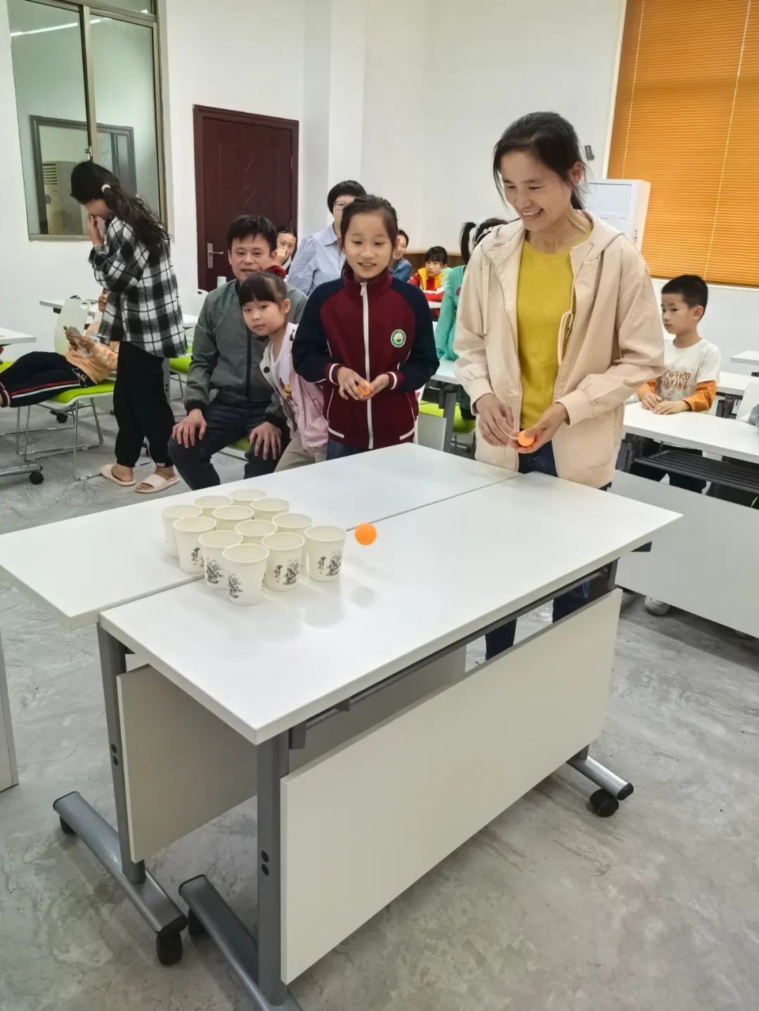 最后一個環(huán)節(jié)是親子游戲比賽,有紙杯保齡球和乒乓球跳進(jìn)杯子贏獎品兩個游戲。第一個游戲由家長負(fù)責(zé)搭紙杯,孩子負(fù)責(zé)打保齡球,用時最少且打掉的紙杯越多的前三組家庭可以獲得獎品。第二個游戲是志愿者給每個家庭準(zhǔn)備5個乒乓球,投進(jìn)放有紙條12宮格紙杯里,投進(jìn)哪個紙杯就獲得相應(yīng)的獎品。兩個游戲都深受家長孩子的喜歡,最后大家也是收獲滿滿。