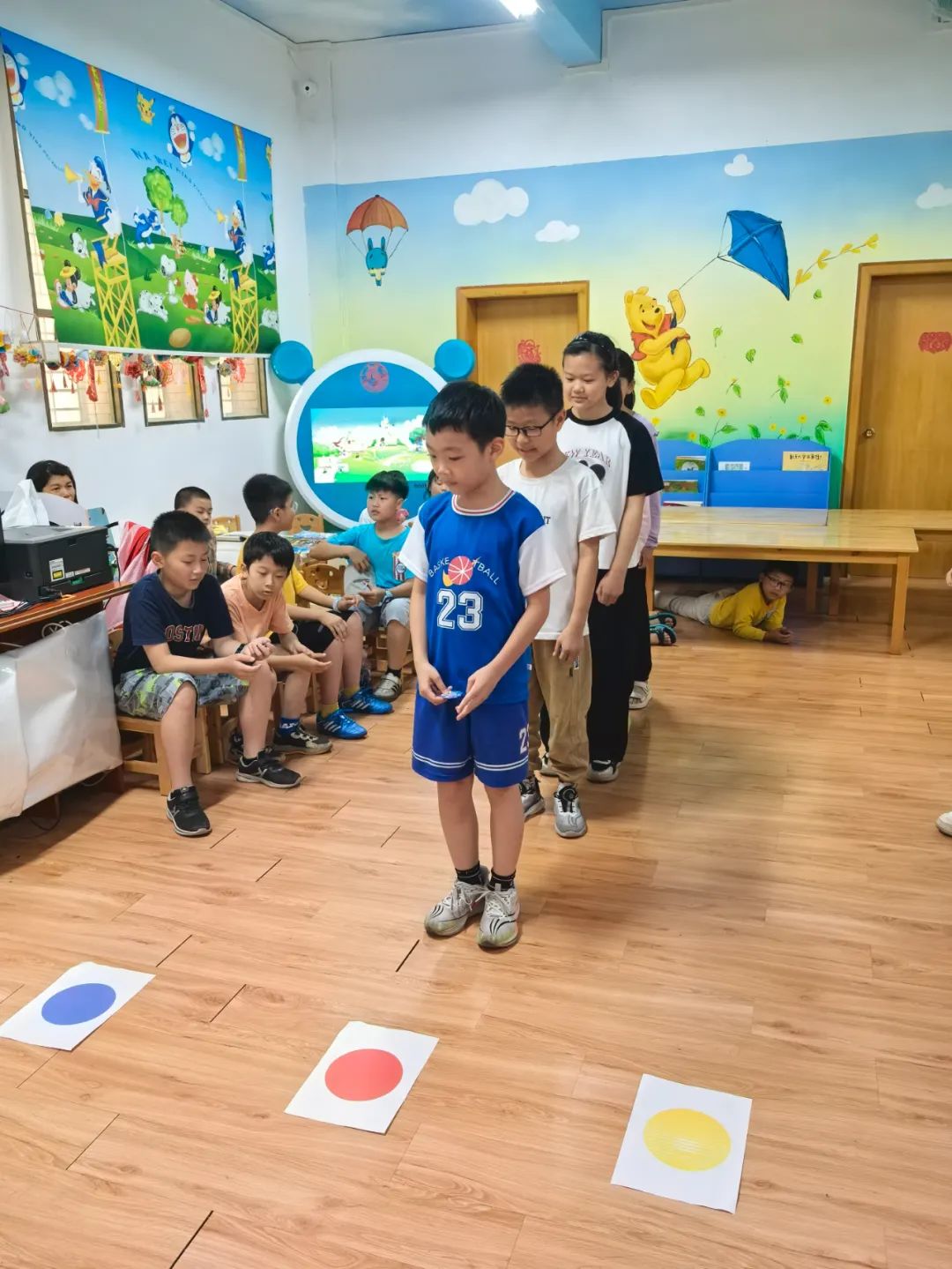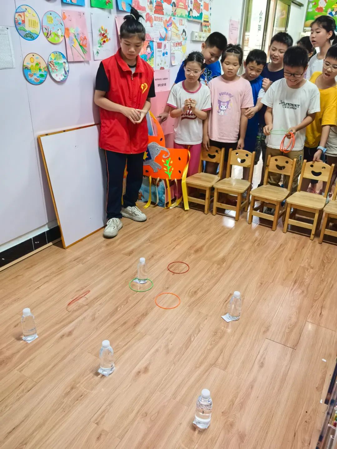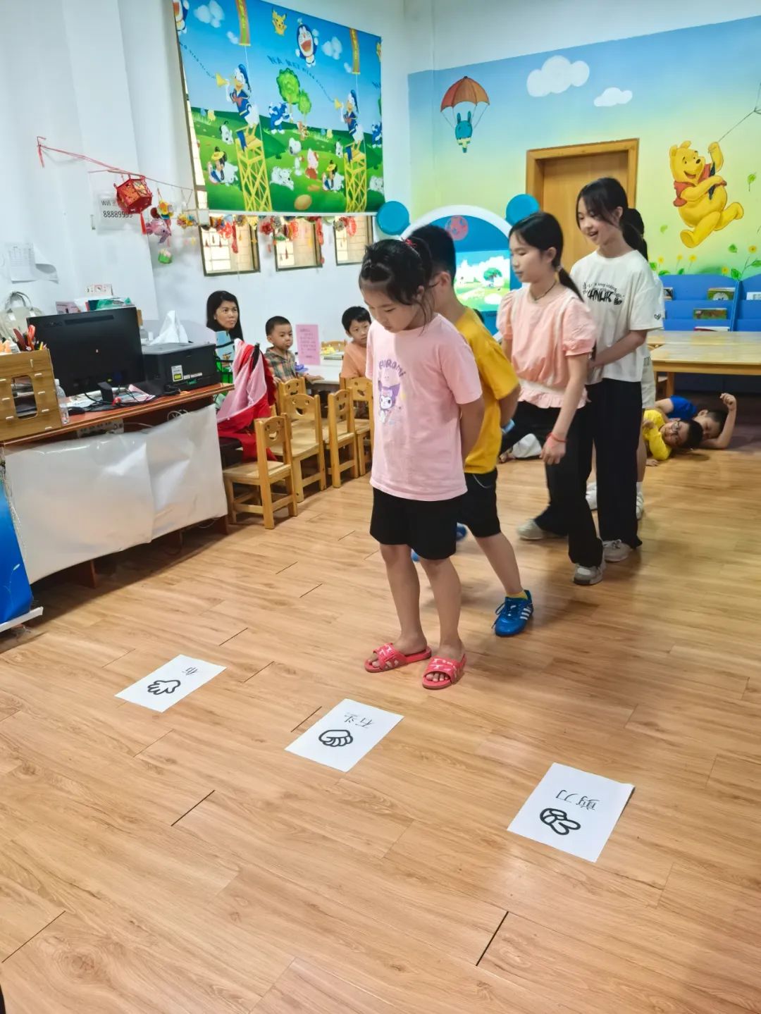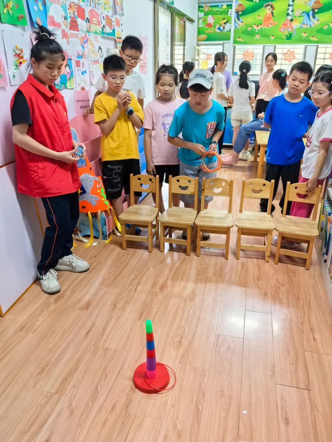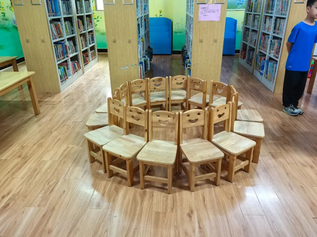 松口圖書館的小瑩老師先給小朋友們講解此次活動8個游戲的玩法以及得分規(guī)則。游戲包括:搶椅子、石頭剪刀布跳躍、紅黃藍(lán)色跳躍、飲料種類跳躍、吹紙牌、數(shù)到30、套水瓶、套益智塔。